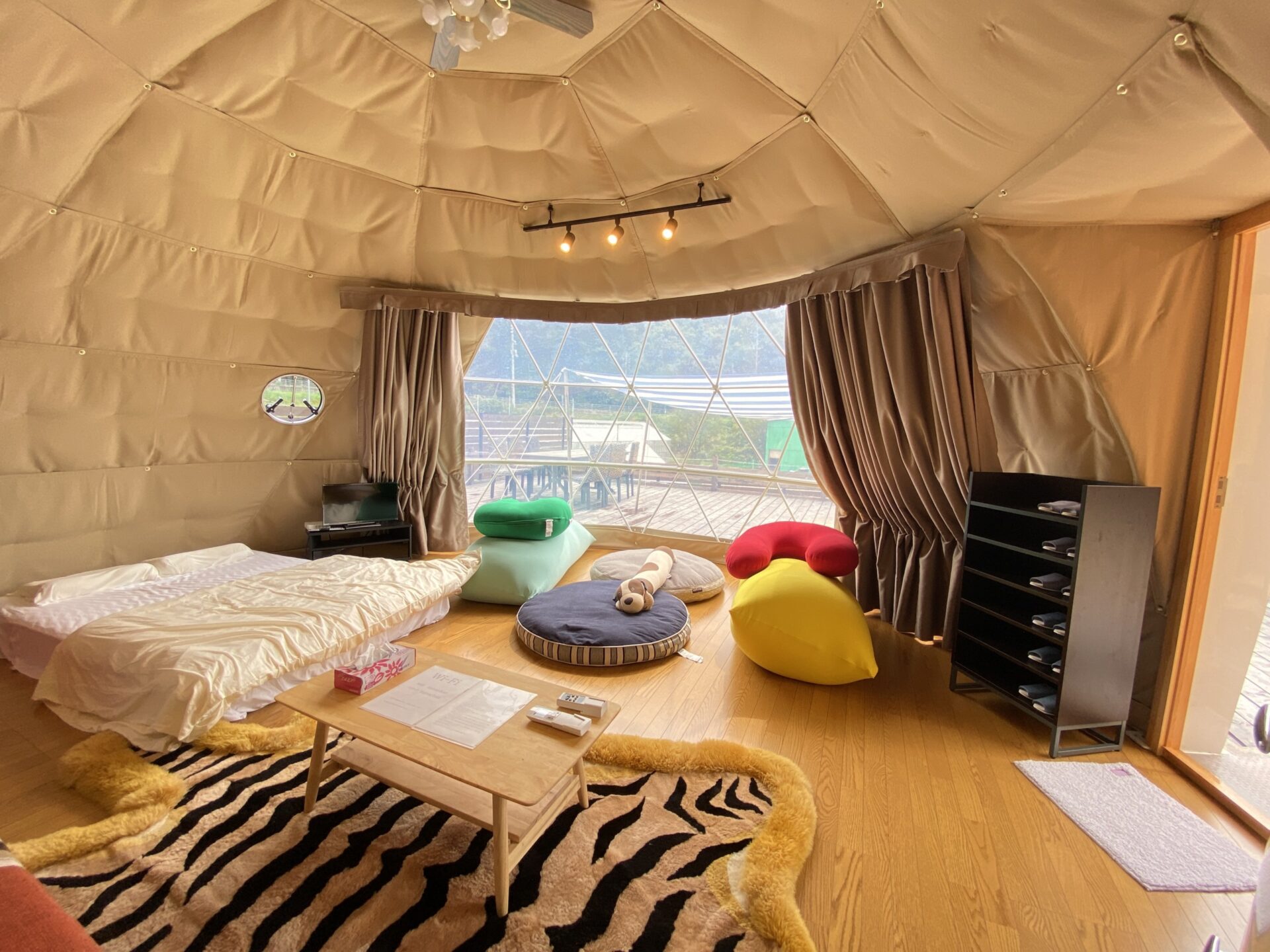 グランピングドームテントの大きさは直径6mになります。テントのカラーはホワイト・ベージュの各1色です。